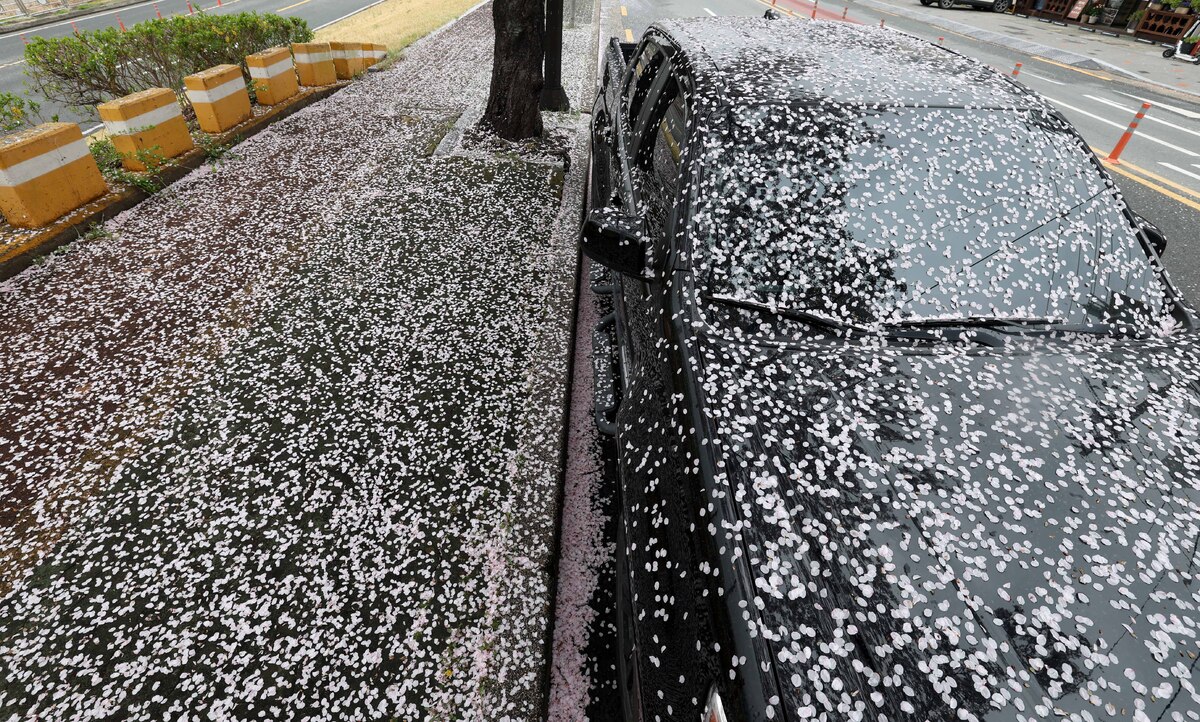 봄비가 오락가락한 6일 오전 경주시 동천동 인도와 주차된 차량을 바람에 떨어진 벚꽃잎이 뒤덮고 있다 . /이용선기자 photokid@kbmaeil.com