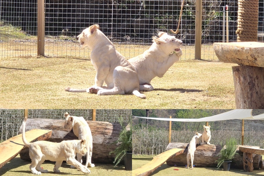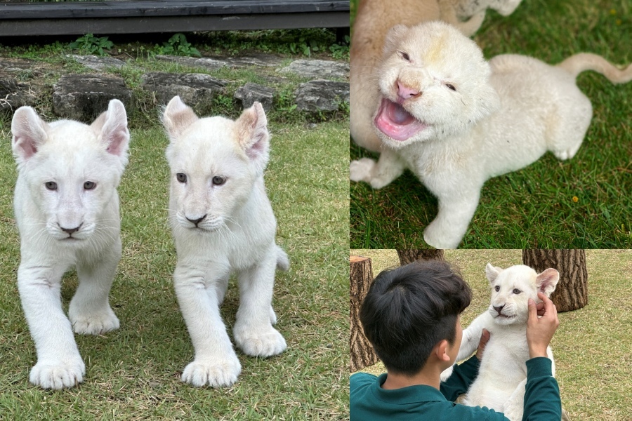 대구 달성군 가창 네이처파크에서 생후 8개월 된 아기 백사자 남매 ‘루카’와 ‘루나’의 봄 나들이가 관람객들의 눈길을 끌고 있다.
