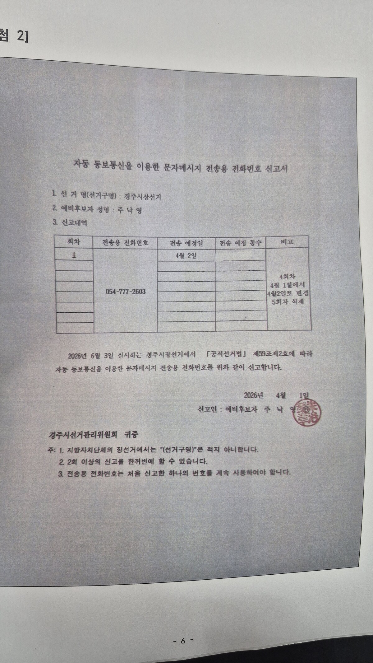 그는 “4월 1일 오후 4시 30분경 선관위 안내에 따라 자동 동보통신 전화번호 신고서를 제출했고, 이후 선관위 요청으로 음성파일을 전달해 사전 검토를 받았다”고 밝혔다.