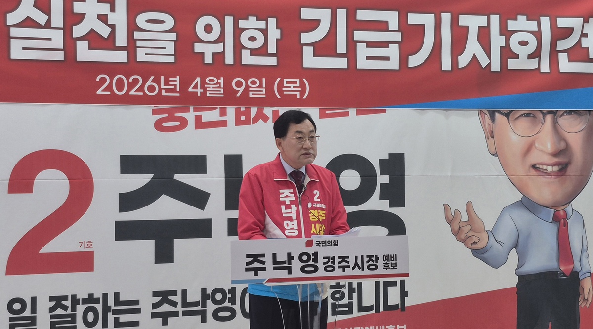 주낙영 국민의힘 경주시장 예비후보가 9일 선거사무실에서 기자회견을 열고 최근 제기된 ‘음성메시지 발송 위법’ 논란에 대해 “선관위 절차에 따른 적법한 선거운동”이라며 정면 반박에 나섰다.