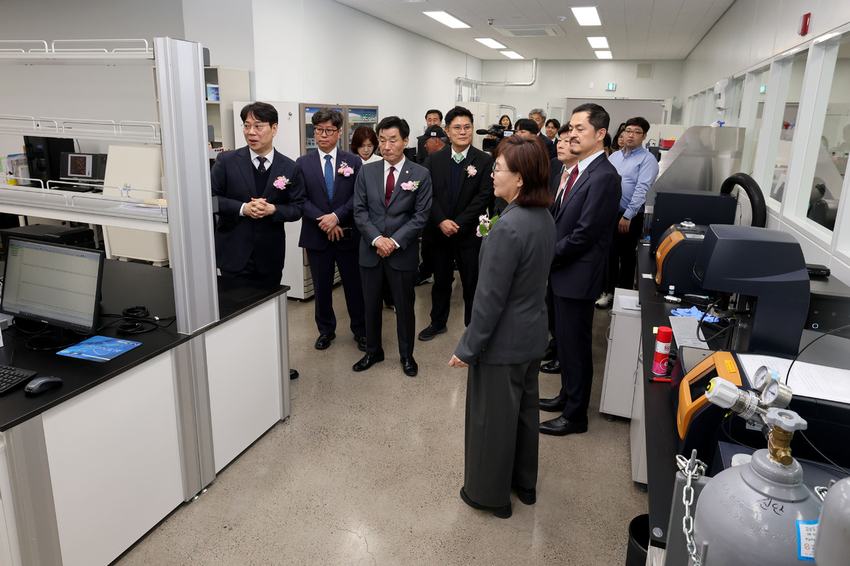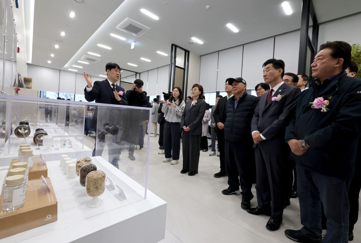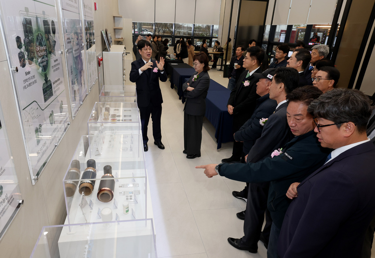 폐기물과 식물에서 추출해 첨단 신소재인 나노셀룰로오스를 만드는 (주)에이엔폴리 본사 및 공장 건립 준공식이 9일 오후 포항시 북구 흥해읍 포항융합기술산업지구에서 열렸다. 노상철 대표가 내빈들에게 회사 시설과 생산과정을 설명하고 있다. /이용선기자 photokid@kbmaeil.com