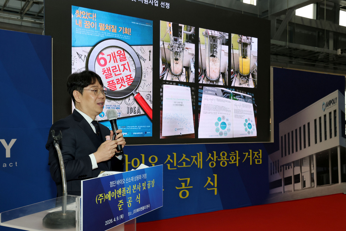 폐기물과 식물에서 추출해 첨단 신소재인 나노셀룰로오스를 만드는 (주)에이엔폴리 본사 및 공장 건립 준공식이 9일 오후 포항시 북구 흥해읍 포항융합기술산업지구에서 열렸다. 노상철 대표, 양금희 경북도 경제부지사, 김일만 포항시의회 의장을 비롯한 내빈들이 축하 테이프를 자르고 있다. /이용선기자 photokid@kbmaeil.com