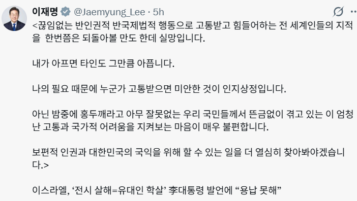 이 대통령은 이날 SNS에, 이스라엘 외무부가 전날 자신의 발언에 대해 반발한 내용을 소개한 기사를 올리고 “끊임없는 반인권적·반국제법적 행동으로 고통받고 힘들어하는 전 세계인의 지적을 한 번쯤은 되돌아볼 만도 한데 실망“이라고 쓴소리를 했다.