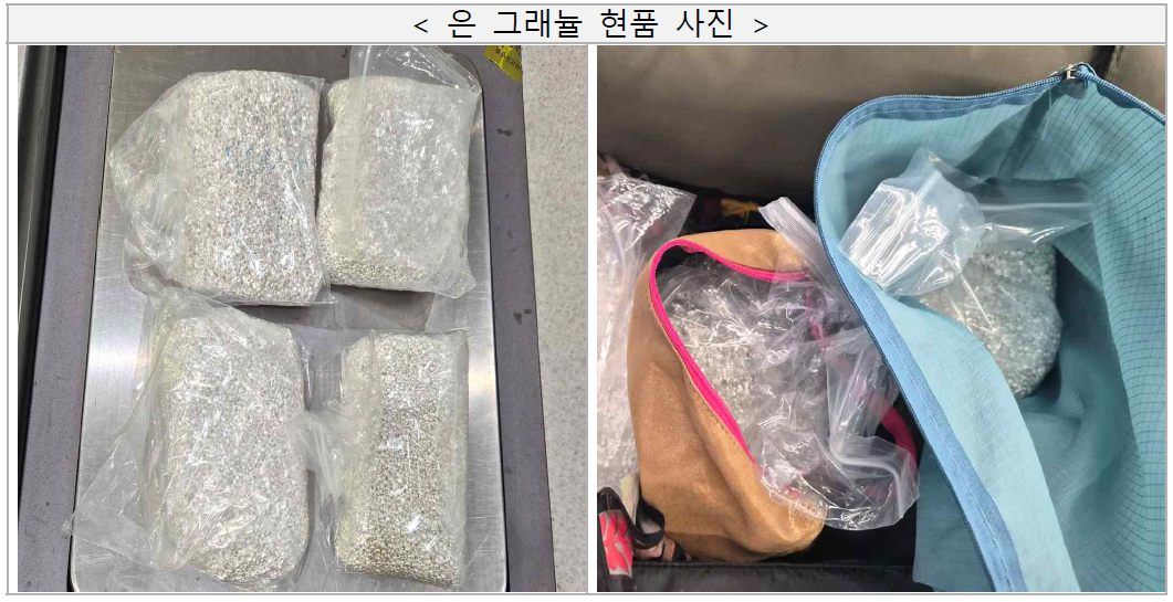 실제 적발 사례를 보면 조직적 범죄 양상이 뚜렷하다. 한 일당은 은 그래뉼을 5kg 단위로 나눠 여행객에게 운반시키는 방식으로 총 567kg(시가 34억원)을 밀수하다 적발됐다.