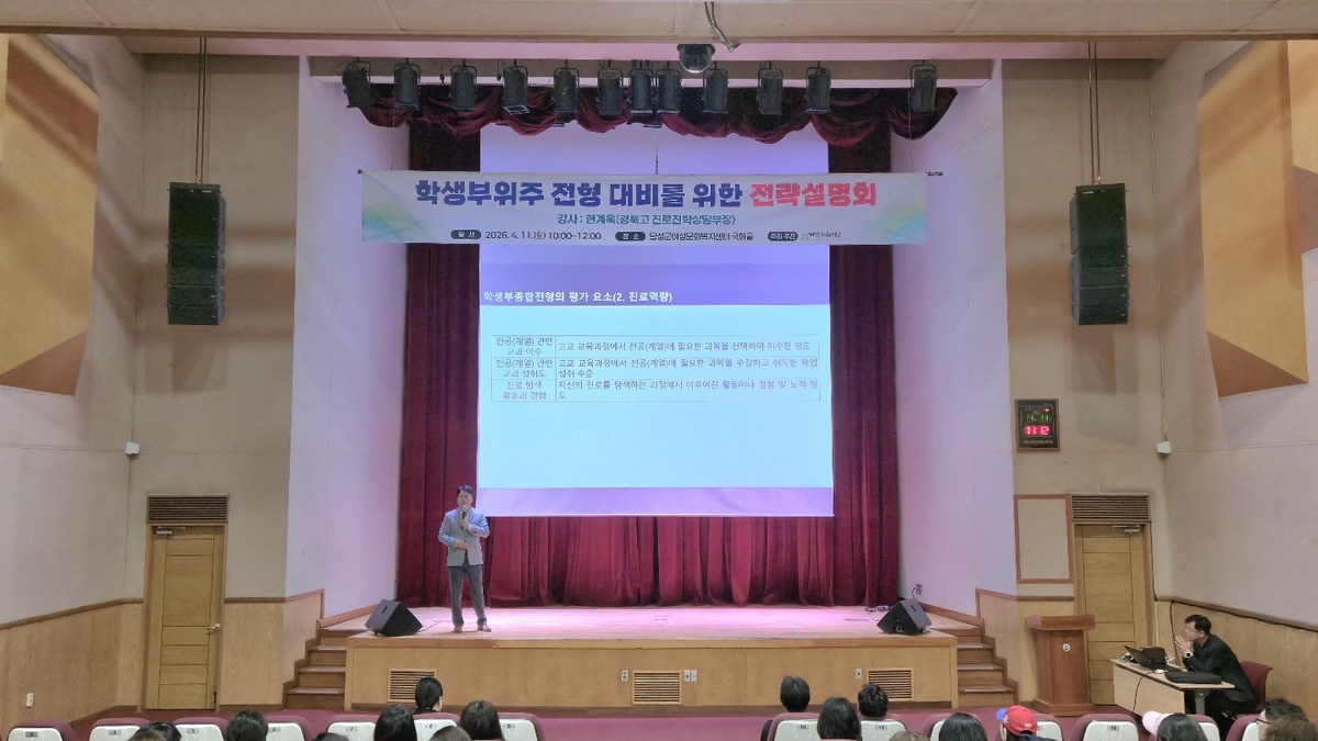 강연에 나선 현계욱 경북고 진로진학상담부장은 “학생부종합전형은 활동의 양이 아니라 고민과 성장의 기록이 핵심”이라며 “대학은 화려한 스펙보다 학교생활 속 자기주도적 역량에 주목한다”고 강조했다.