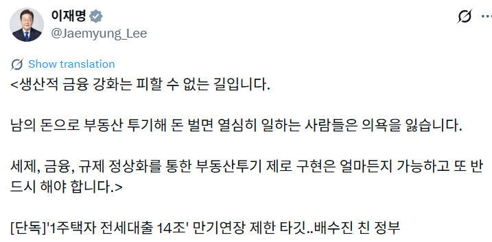 이재명 대통령은 12일 엑스(X·옛 트위터)에 올린 글을 통해 “세제, 금융, 규제 정상화를 통한 부동산투기 제로 구현은 얼마든지 가능하고 또 반드시 해야 한다”고 부동산 시장 정상화 정책에서 한 발짝도 물러설 뜻이 없음을 분명히 했다.