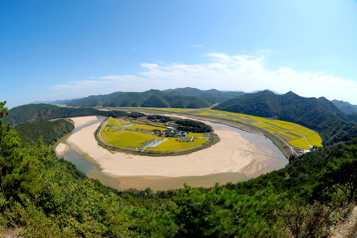 낙동강이 굽이굽이 한 바퀴 크게 감아 돌며 만들어낸 이 아름다운 물돌이 지형은 마치 푸른 물 위에 섬 하나가 떠 있는 듯한 신비로운 모습이다.