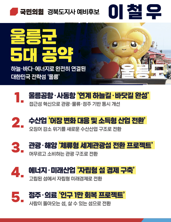 이철우 경북도지사 예비후보가 13일 울릉군 발전을 위한 5대 핵심 공약을 발표하며 “울릉을 더 이상 고립된 섬이 아닌, 스스로 성장하고 지속가능한 구조를 갖춘 대한민국 전략섬으로 만들겠다”고 밝혔다.