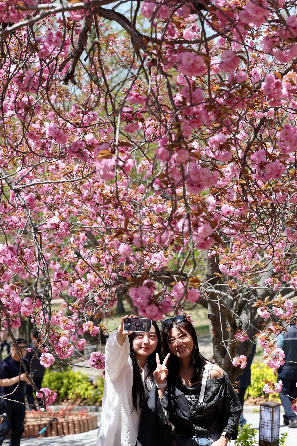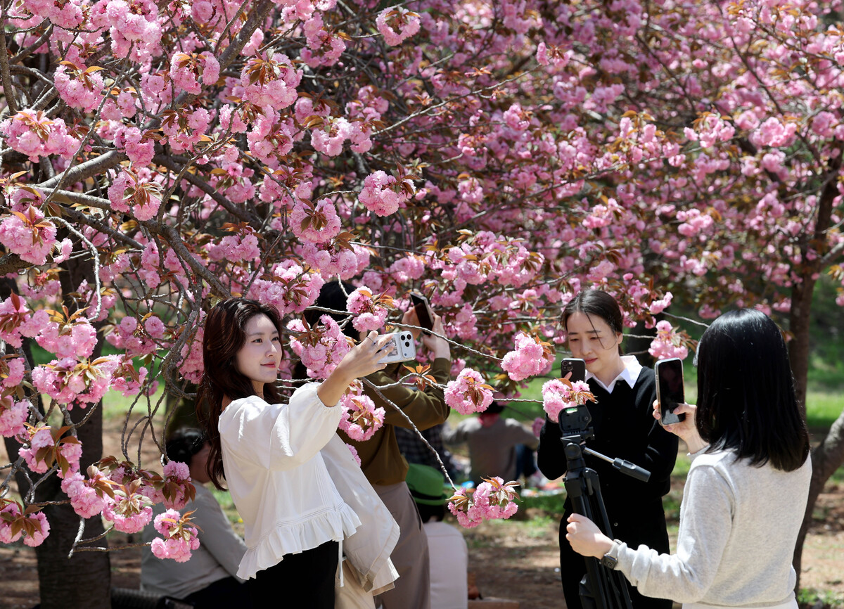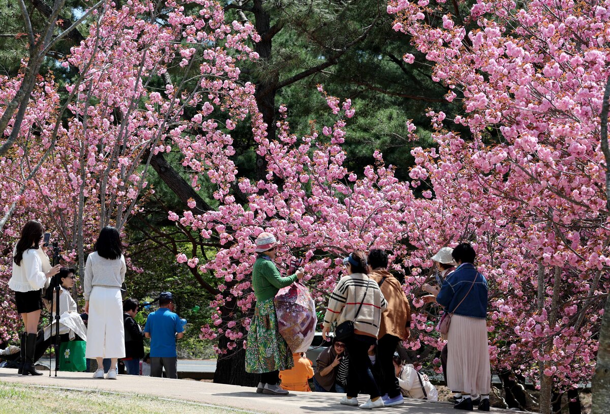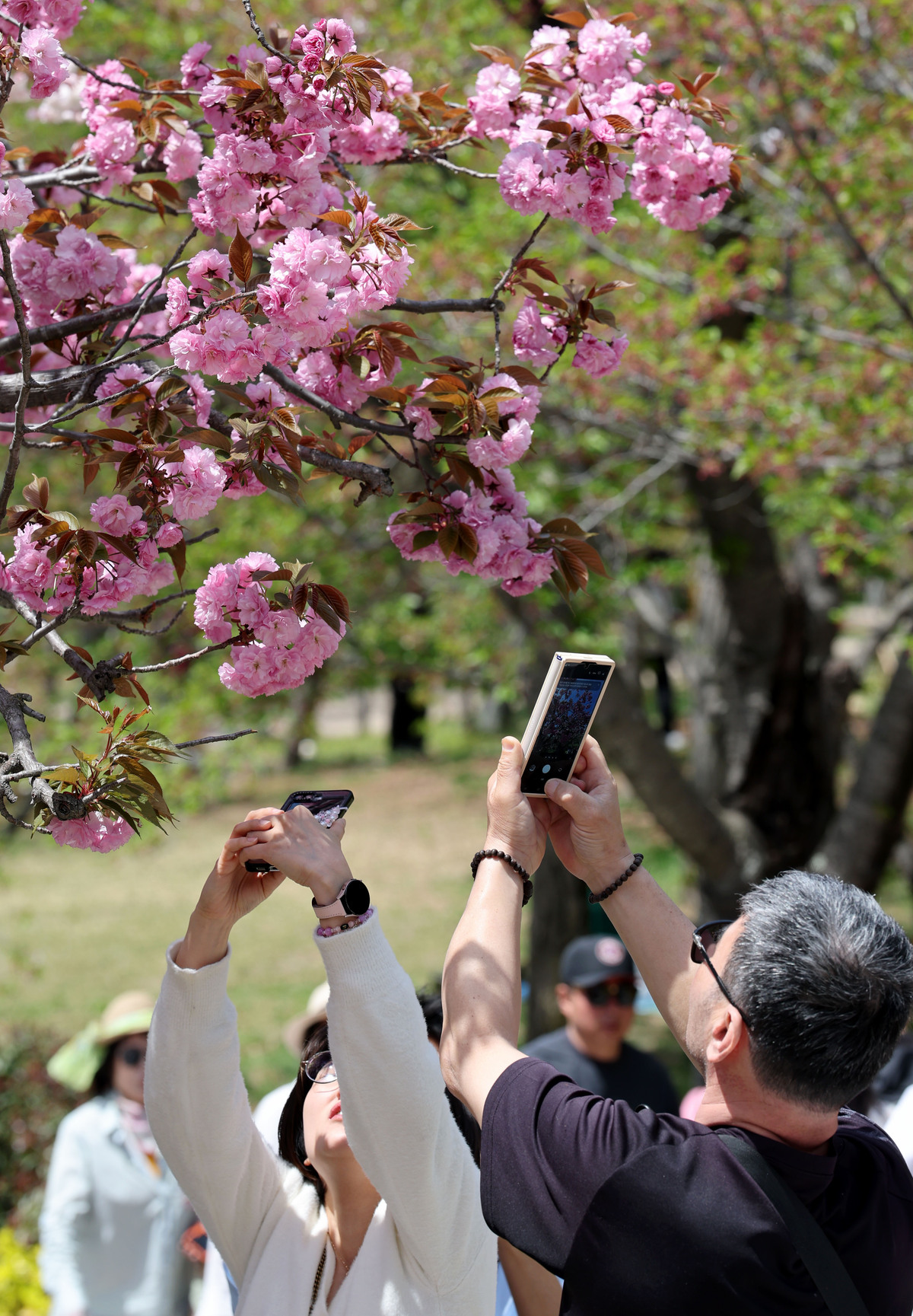 불국사 공원의 겹벚꽃 나무에 진분홍빛 겹벚꽃의 본격적인 개화가 시작되면서 벚꽃잎이 사라진 아쉬움을 채워주고 있다. 이곳에 있는 300여 그루의 겹벚꽃 나무의 화려한 겹벚꽃은 이번 주말 절정을 이룰 전망이다. 15일 오후 불국사 공원을 찾은 관광객들이 봄날의 추억을 카메라에 담고 있다. /이용선기자 photokid@kbmaeil.com