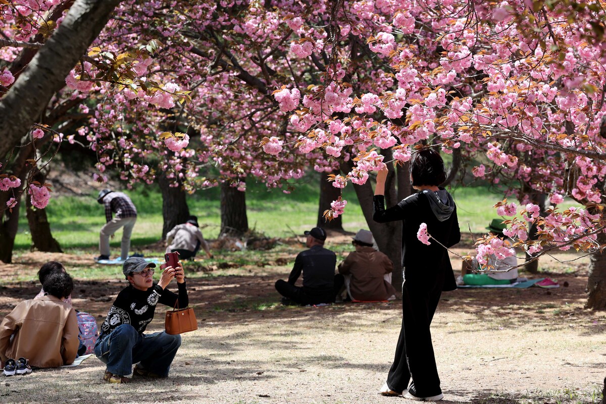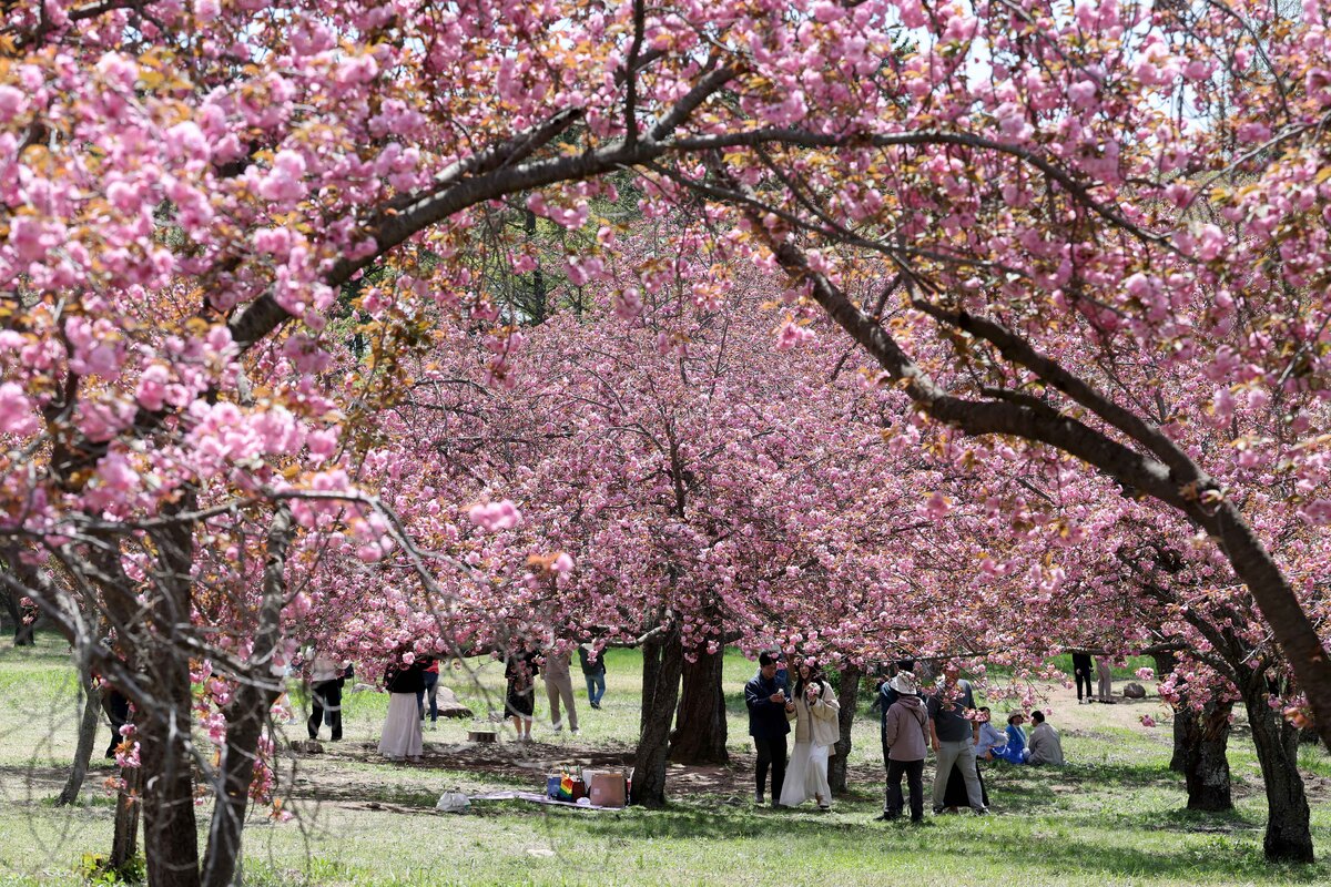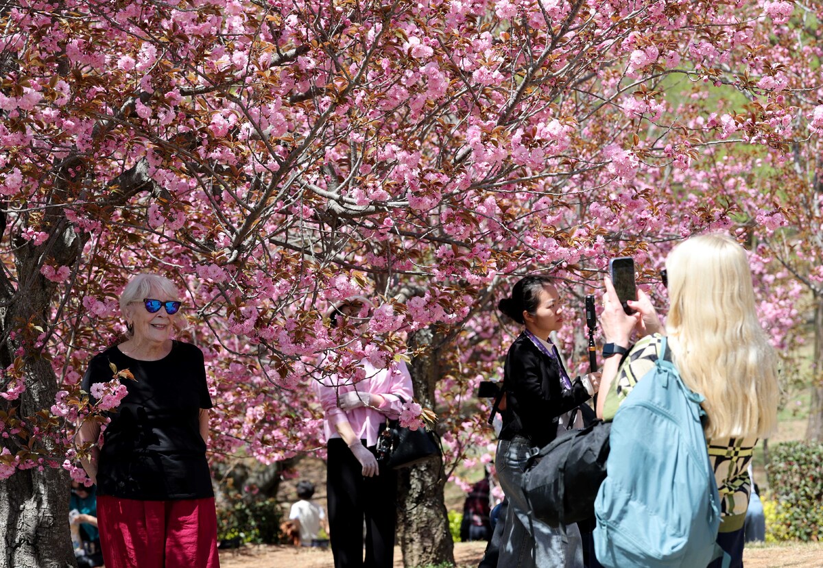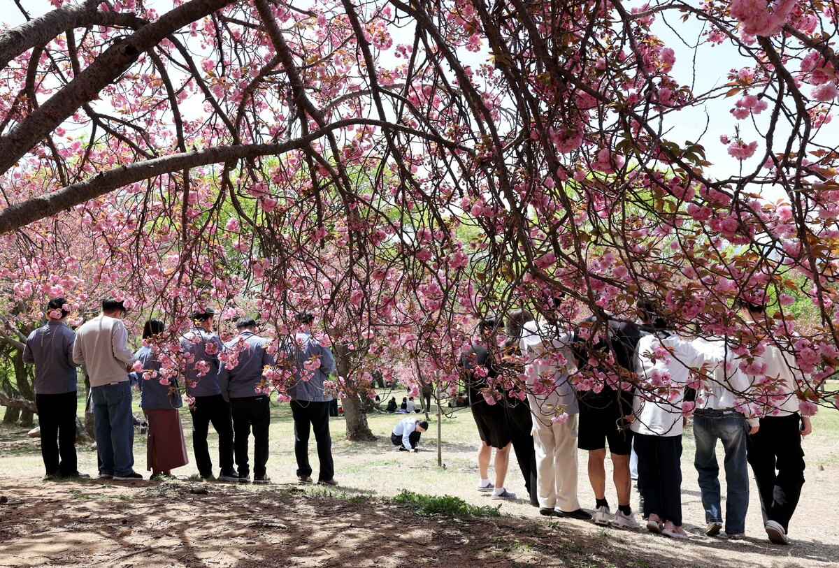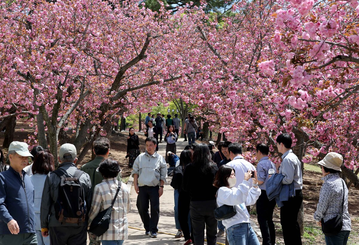 불국사 공원의 겹벚꽃 나무에 진분홍빛 겹벚꽃의 본격적인 개화가 시작되면서 벚꽃잎이 사라진 아쉬움을 채워주고 있다. 이곳에 있는 300여 그루의 겹벚꽃 나무의 화려한 겹벚꽃은 이번 주말 절정을 이룰 전망이다. 15일 오후 불국사 공원을 찾은 관광객들이 봄날의 추억을 카메라에 담고 있다. /이용선기자 photokid@kbmaeil.com