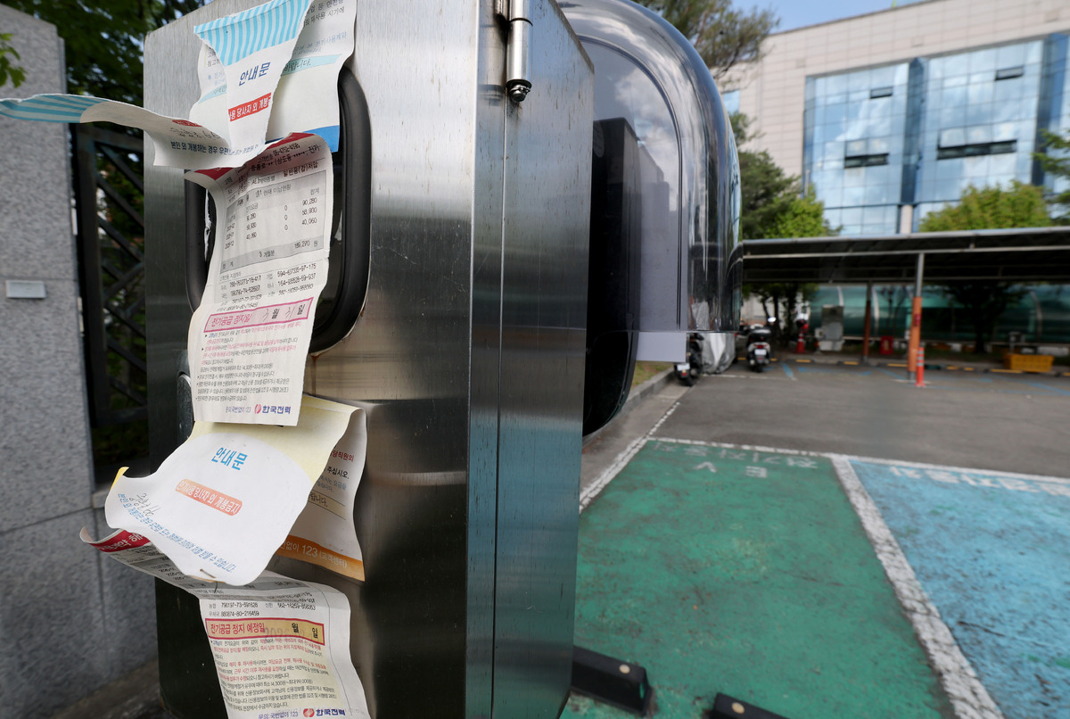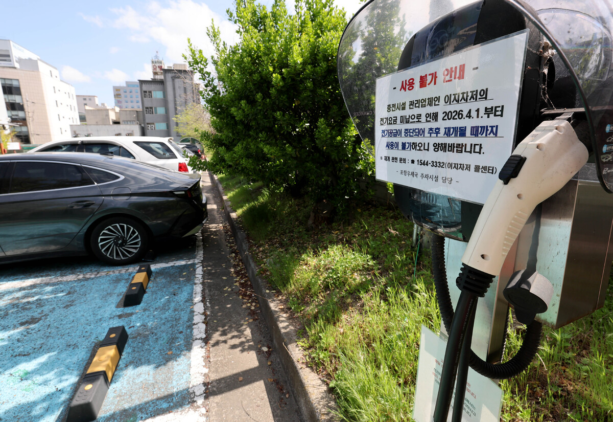 전기차 이용자 권모 씨(35)는 지난 14일 오전 포항우체국 주차장을 찾았다가 낭패를 봤다. 급하게 충전이 필요해 관공서 주차장 충전소를 찾았지만, 충전기는 꺼져 있었고 기기 뒤편엔 한국전력이 발행한 ‘전기공급 정지 안내문’만 붙어 있었다.