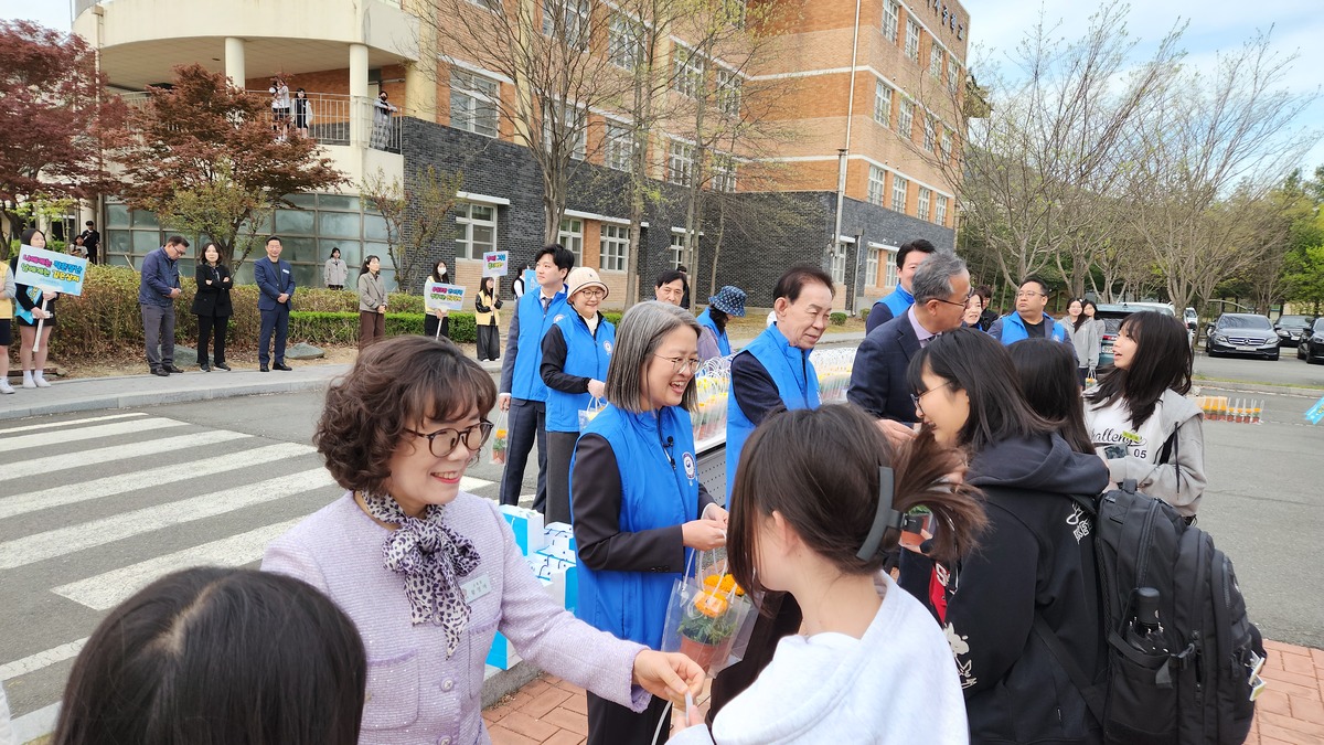 범방 측은 “학교폭력 없는 행복한 학교를 만들자는 의미를 담았다”고 설명했다. 등굣길 학생들은 꽃을 받아 들고 웃으며 교문을 들어섰다.