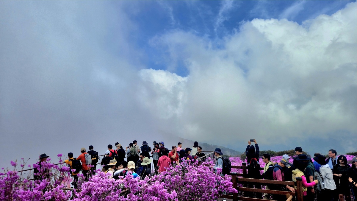 정상 능선에는 만개한 참꽃이 연분홍 물결을 이루며 펼쳐졌다. 능선을 따라 흐르는 꽃물결은 붉은 카펫처럼 이어졌고, 탐방객들의 발길과 감탄이 끊이지 않았다. 대견사 일대에서는 운해와 참꽃이 어우러진 장관이 연출됐고, 담장에 앉아 구름 위 풍경을 바라보며 컵라면을 즐기는 이색 장면도 눈길을 끌었다.