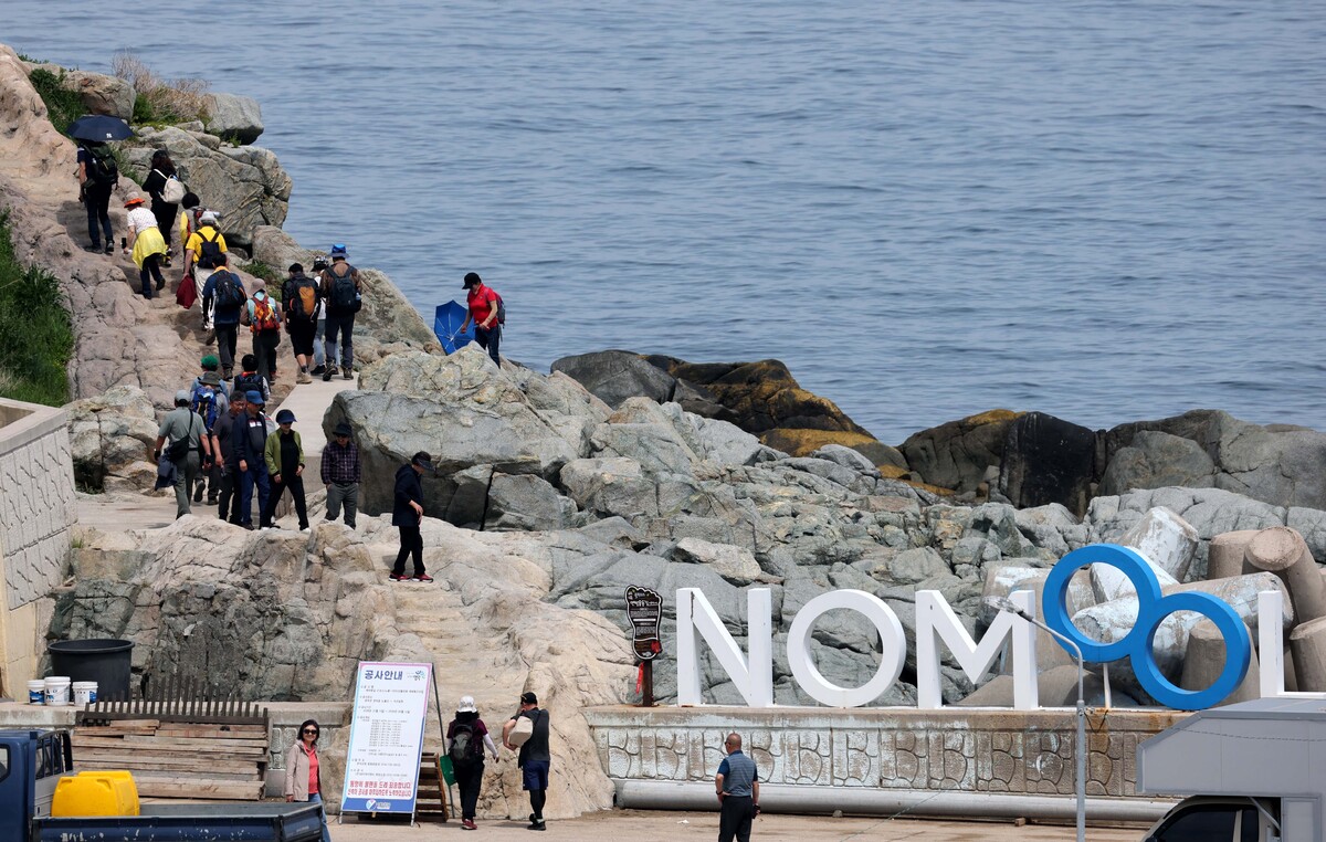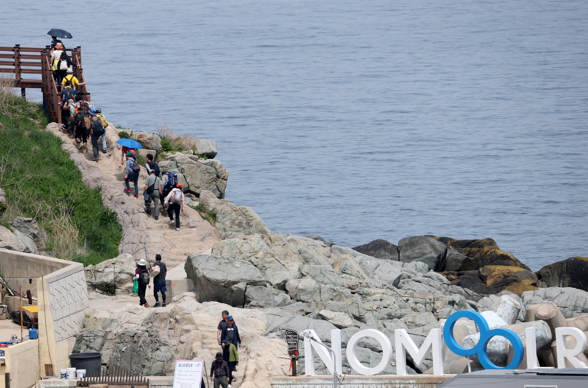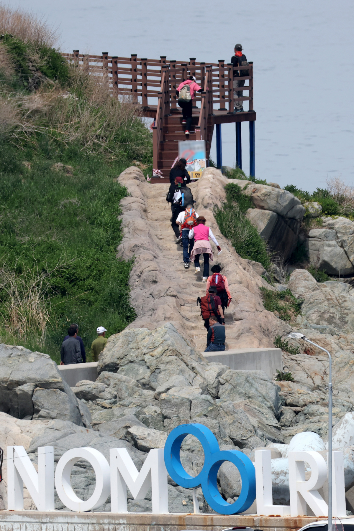 화창한 봄 날씨를 보인 19일 오후 지난해 발생한 초대형 산불로 큰 피해를 본 영덕군 영덕읍 노물리를 찾은 관광객들이 해파랑길을 산책하고 있다. /이용선기자 photokid@kbmaeil.com