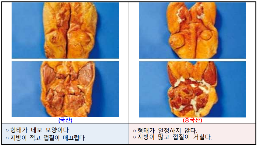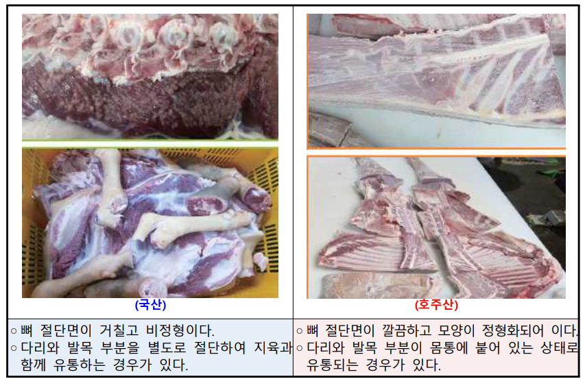 한편, 농관원은 소비자 피해 예방을 위해 원산지 식별 요령도 안내했다. 자료에 따르면 국산 염소고기는 뼈 절단면이 거칠고 비정형적인 반면, 수입산은 절단면이 매끄럽고 형태가 일정한 특징이 있다. 오리고기(훈제)의 경우 국산은 네모난 형태에 지방이 적고 껍질이 매끄럽지만, 중국산은 모양이 일정하지 않고 지방이 많으며 껍질이 거친 것으로 나타났다.