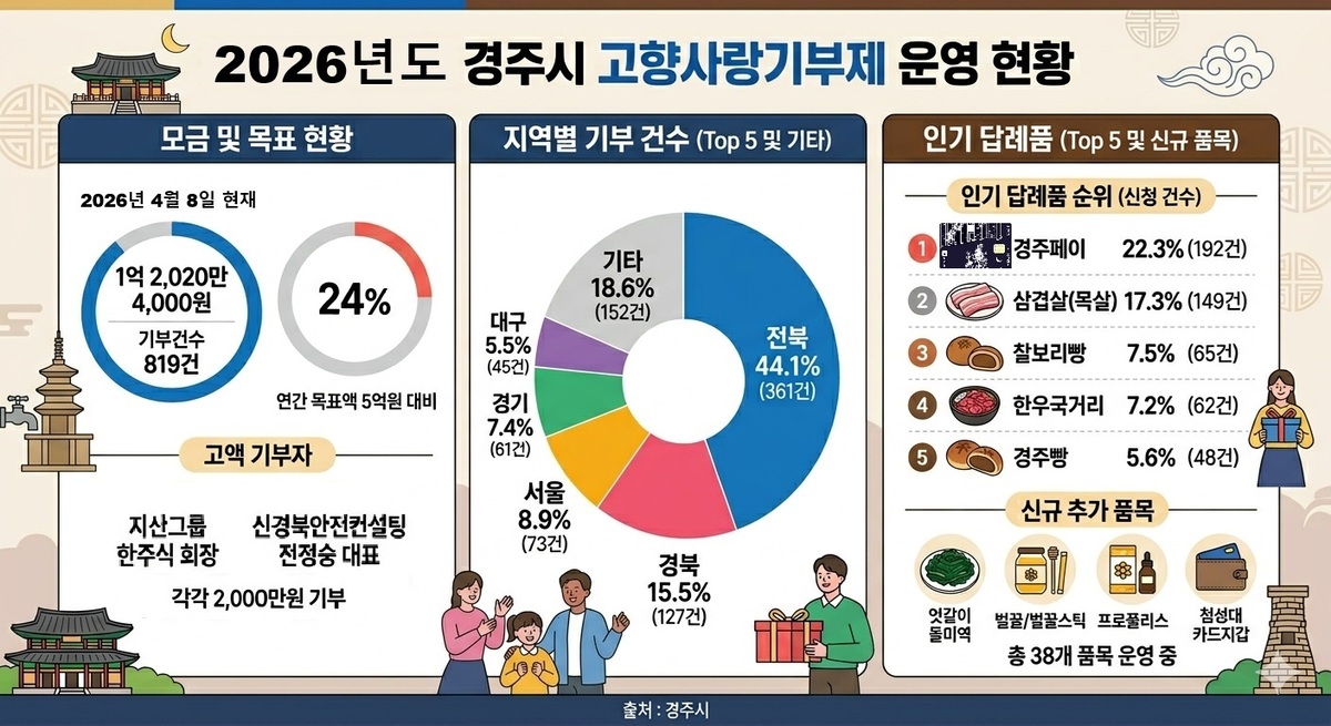 최혁준 경주시장 권한대행은 “고향사랑기부제는 지역과 기부자가 함께 성장하는 제도”라며 “참여 확대와 답례품 다양화를 통해 지역경제 활성화로 이어가겠다”고 말했다.