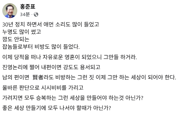홍준표 전 대구시장이 21일 페이스북에 “올바른 판단으로 시시비비를 가리고 가려지면 모두 승복하는 그런 세상을 만들어야 한다”며 “좋은 세상 만들기에 모두 나서야 할 때”라고 제안했다.
