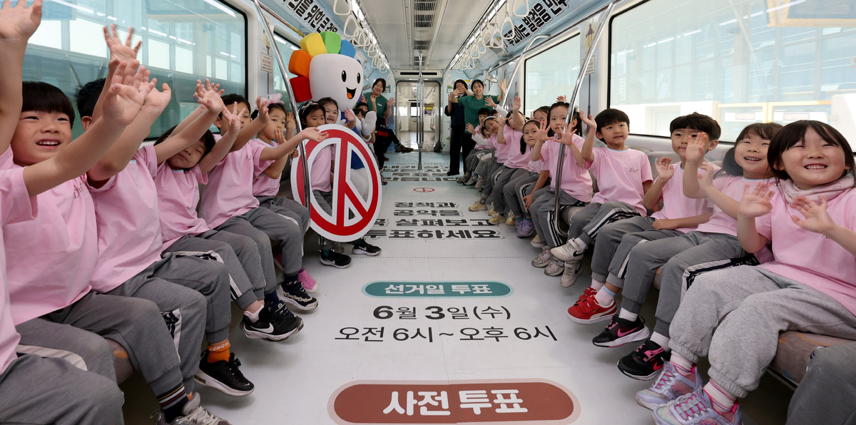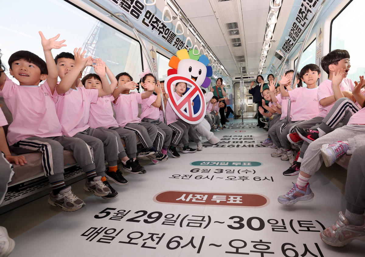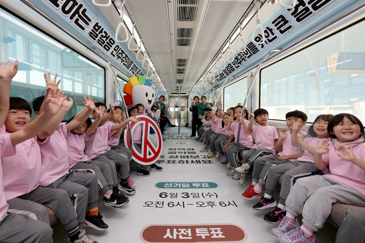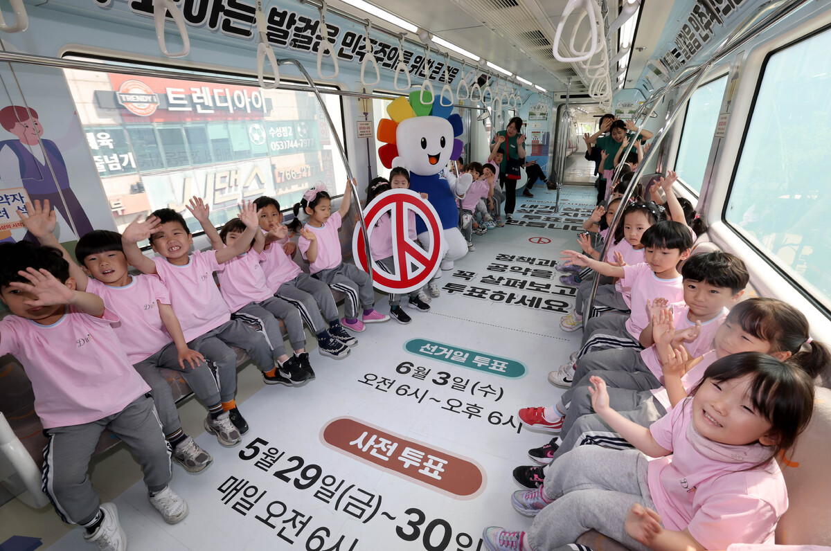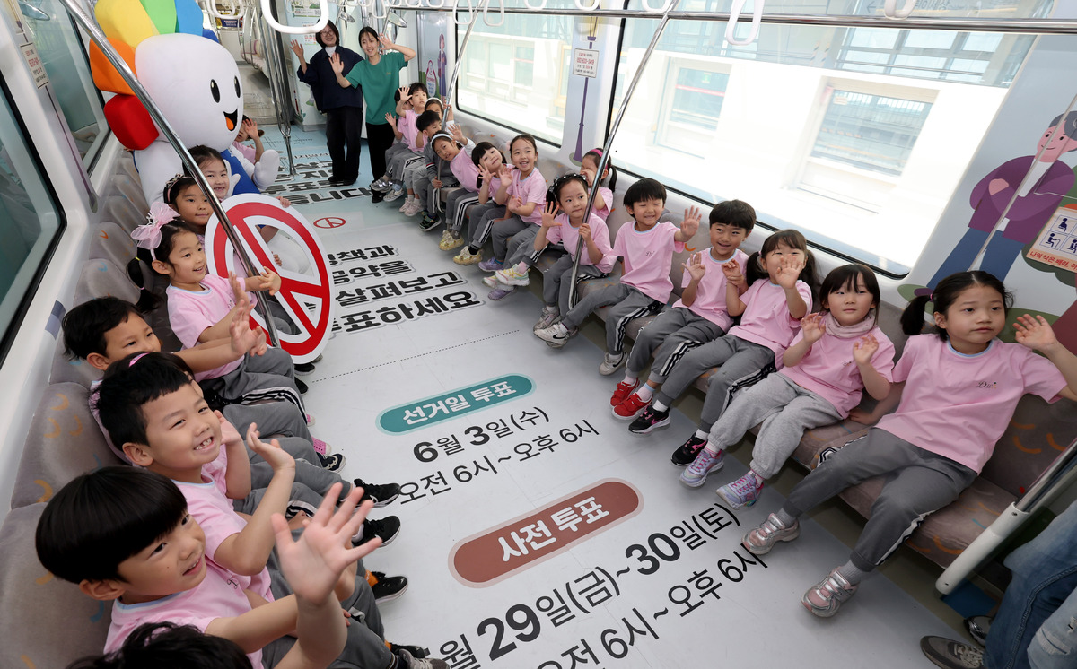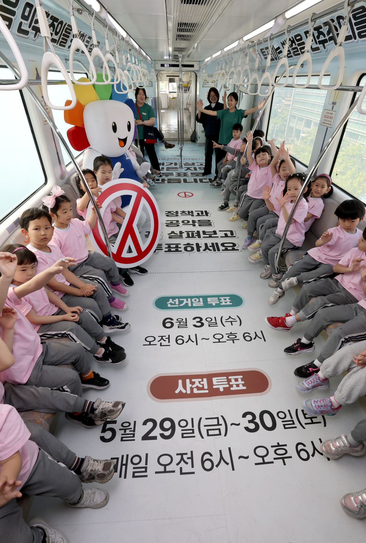 제9회 전국동시지방선거를 앞둔 21일 오전 열차 내·외부를 선거 정보로 꾸민 대구 도시철도 3호선 선거 열차에서 미래 유권자인 대원유치원 원생 30여 명과 선생님이 투표 참여 캠페인을 하고 있다. 대구시선관위 관계자는 “선거 열차는 시민들이 선거에 대한 정보를 생활 속에서 접하도록 선거일인 6월 3일까지 운행된다.”라고 전했다. /이용선기자 photokid@kbmaeil.com