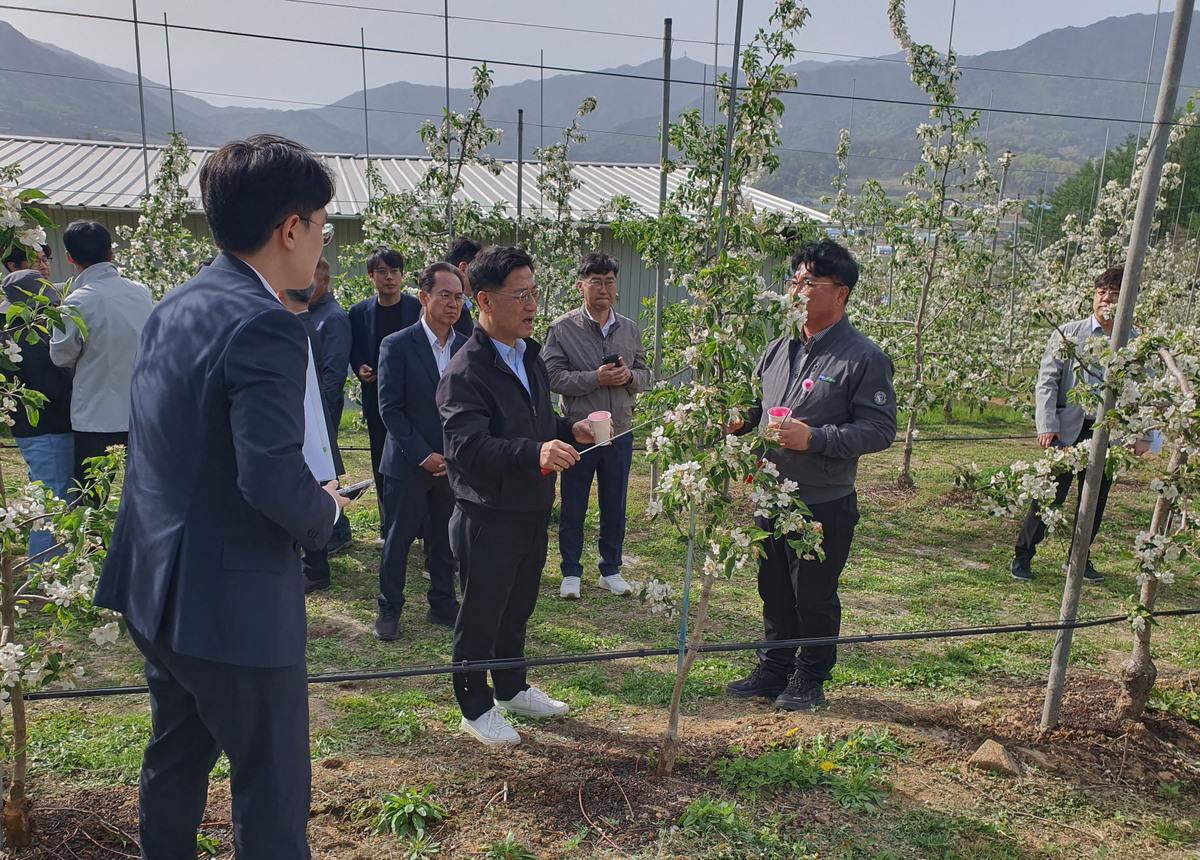 이번 현장 방문은 이상기후로 사과 생산의 불안정성이 커지는 상황에서 현장의 생육 상태를 직접 확인하고 안정적인 생산을 위한 기술 적용 방안을 논의하기 위해 마련됐다.