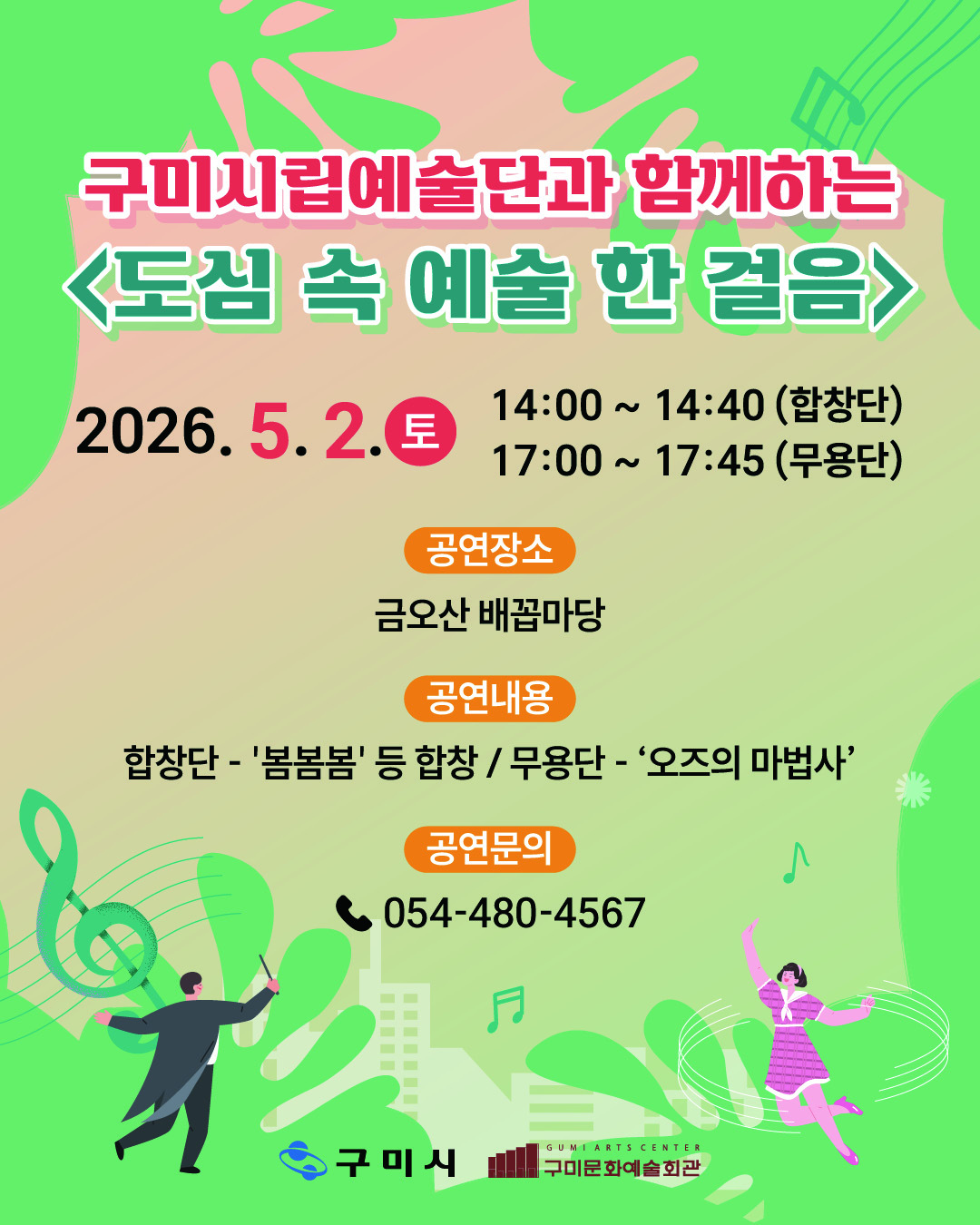 구미시는 가정의 달을 맞아 5월 2일 금오산 배꼽마당에서 구미시립예술단과 함께하는 야외공연 ‘도심 속 예술 한 걸음’을 개최한다.
