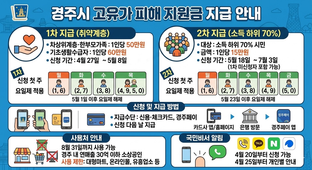 지급 수단은 신용·체크카드 또는 지역화폐인 ‘경주페이’ 가운데 선택할 수 있으며, 신청 다음 날 지원금이 충전된다.