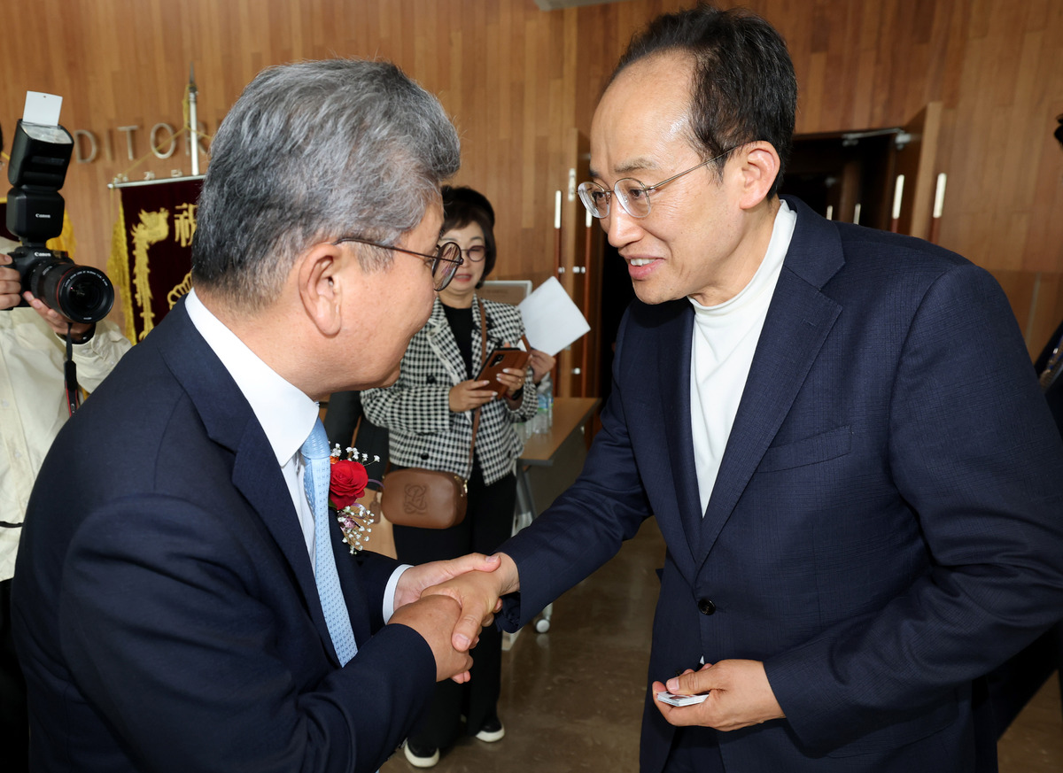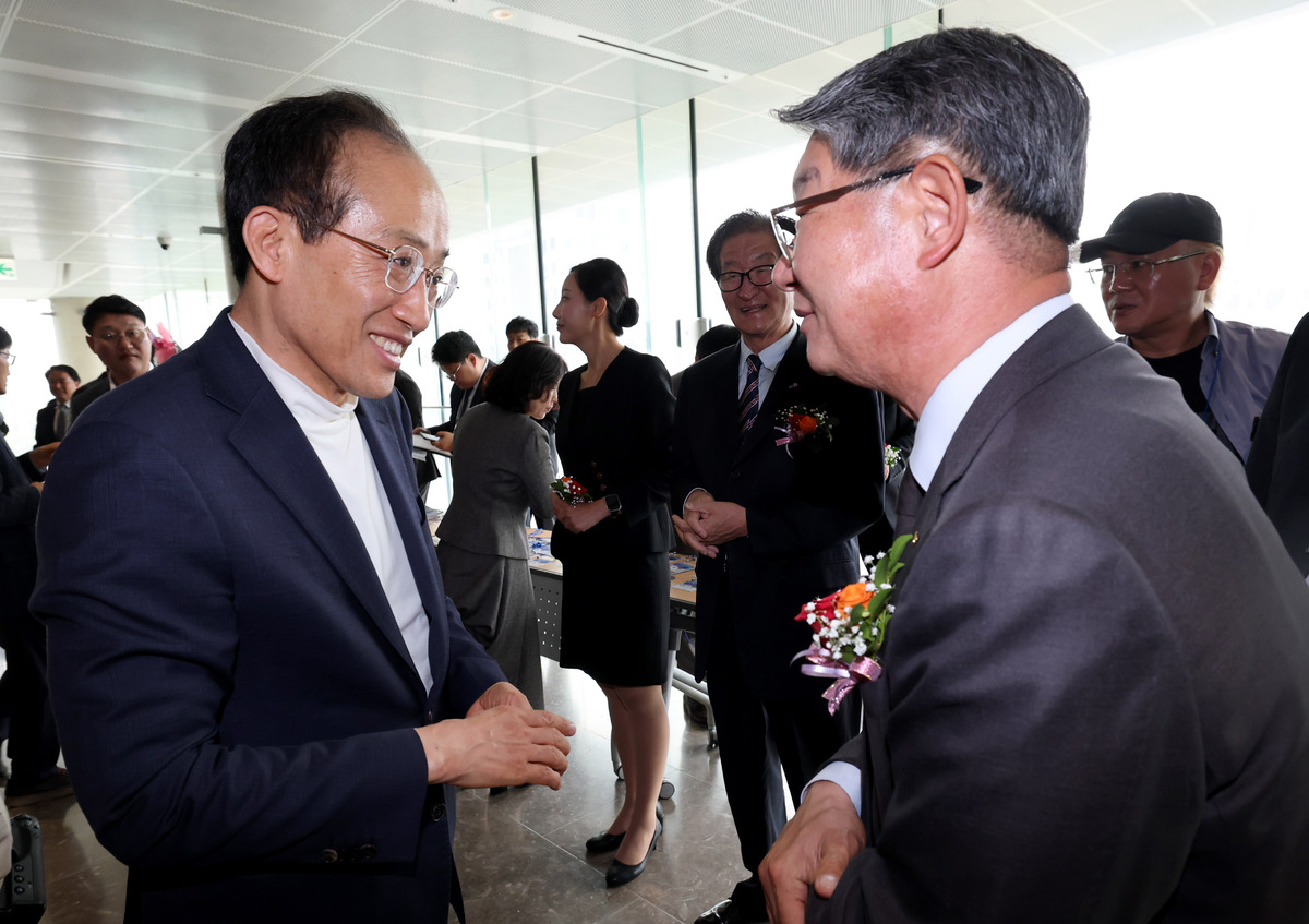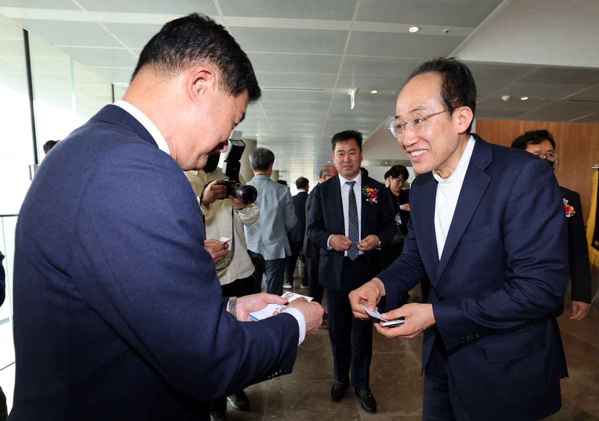 추경호 국민의힘 대구시장 예비후보가 22일 오후 대구 북구 iM뱅크에서 열린 ‘제71회 정보통신의 날 기념행사’에서 참석자들과 인사하고 있다. /이용선기자 photokid@kbmaeil.com