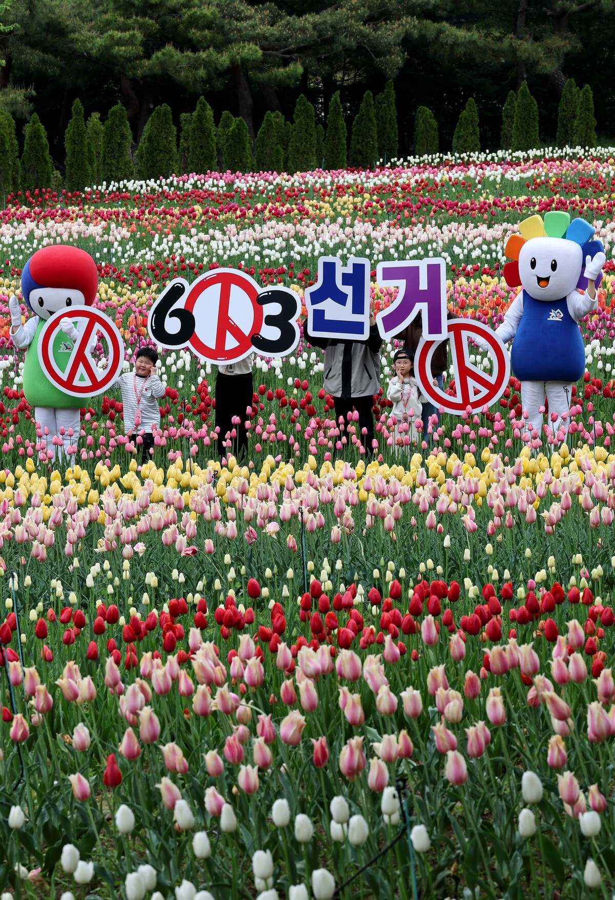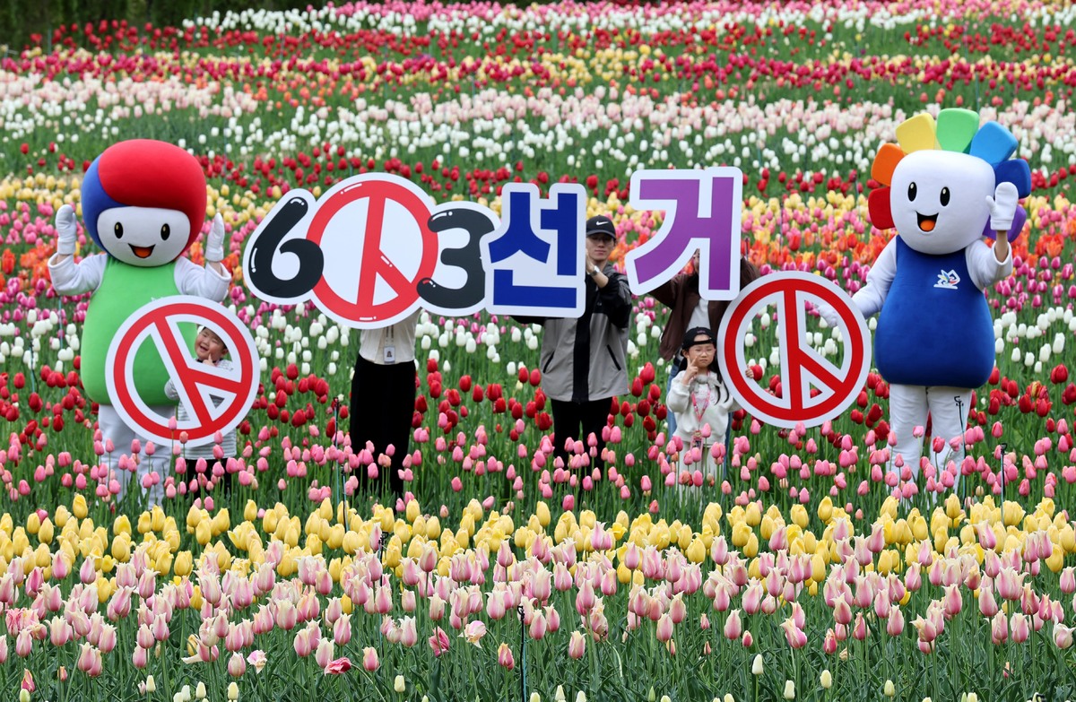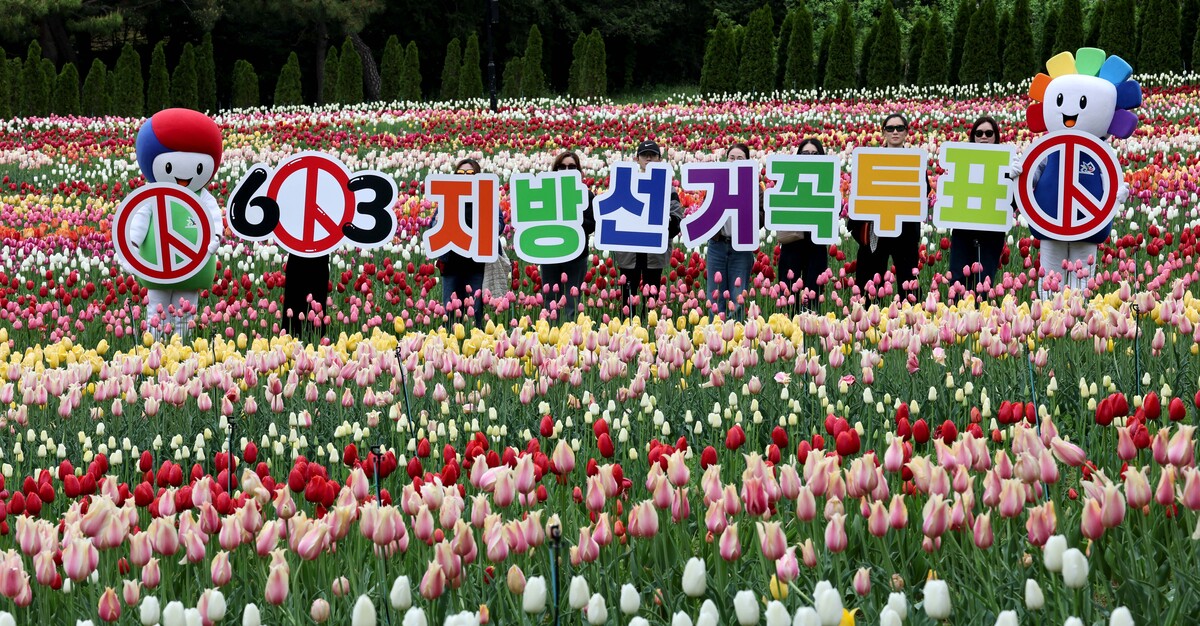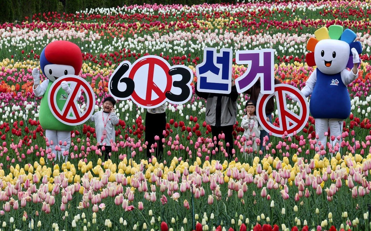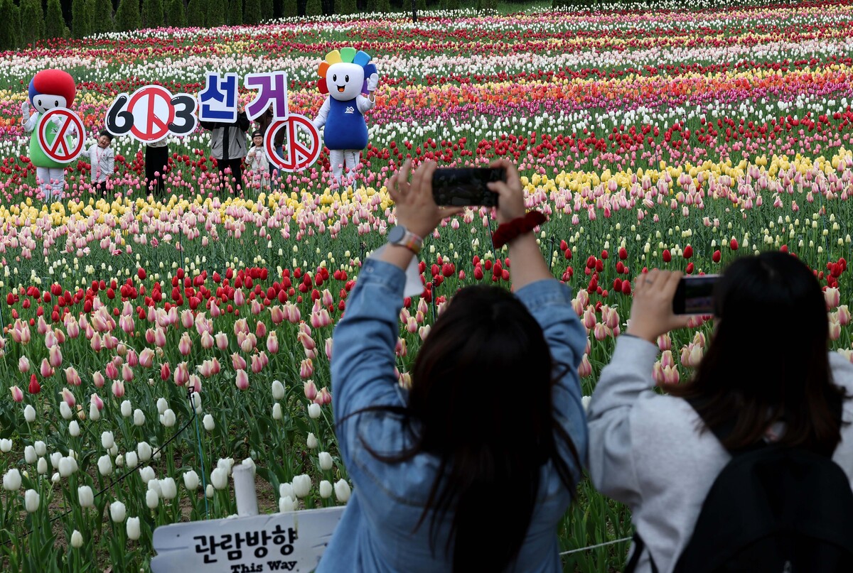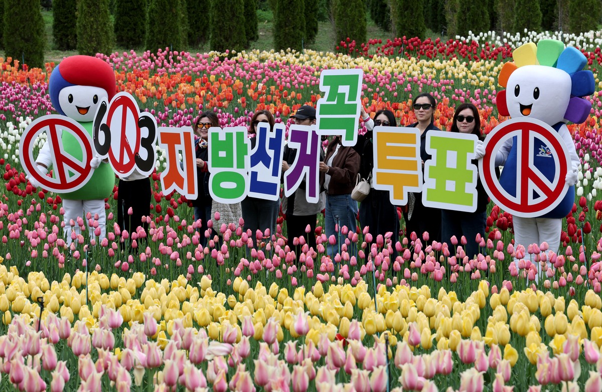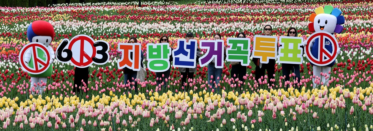 제9회 전국동시지방선거가 42일 앞둔 22일 오전 대구시 달서구 이월드 100만 송이 튤립 정원에서 대구시선관위 관계자와 튤립정원을 찾은 시민이 투표 참여 캠페인을 펼치고 있다. /이용선기자 photokid@kbmaeil.com