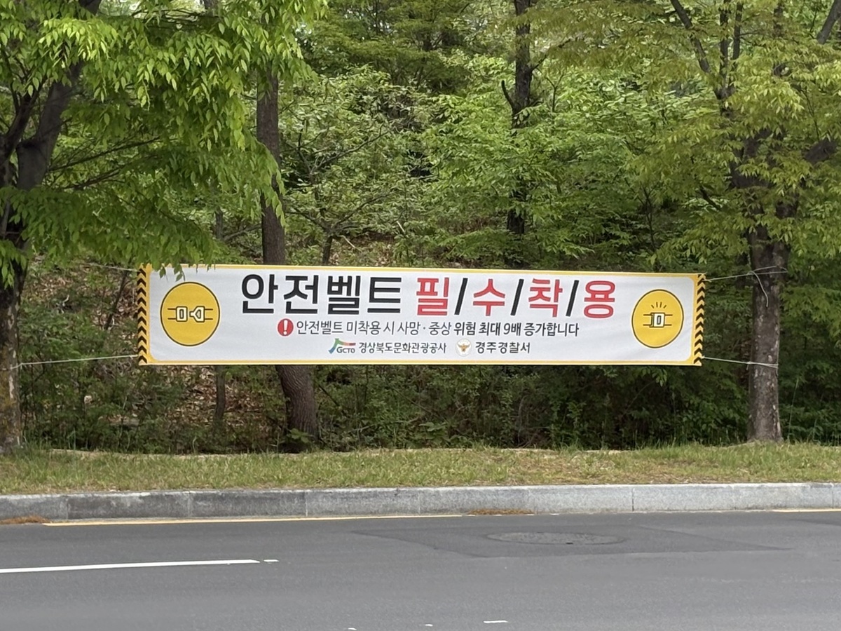 경주경찰서는 최근 증가하는 교통사고 위험에 선제적으로 대응하기 위해 경주시 내 주요 교차로와 관광지, 대형 주차장 진출입로 등에 안전벨트 착용 홍보 현수막을 설치했다.