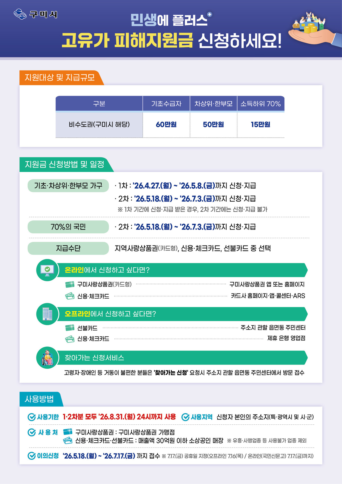 지원금은 선불카드, 신용·체크카드, 구미 사랑 상품권(카드형) 중 하나를 선택하여 사용할 수 있다. 사용 제한 업종을 제외한 연 매출액 30억 이하 구미시 관내 소상공인 업체에서 사용할 수 있으며, 구미 사랑 상품권은 상품권 가맹점에서만 사용할 수 있다. 1·2차 지급분 8월 31일까지 구미시에서만 사용할 수 있다.