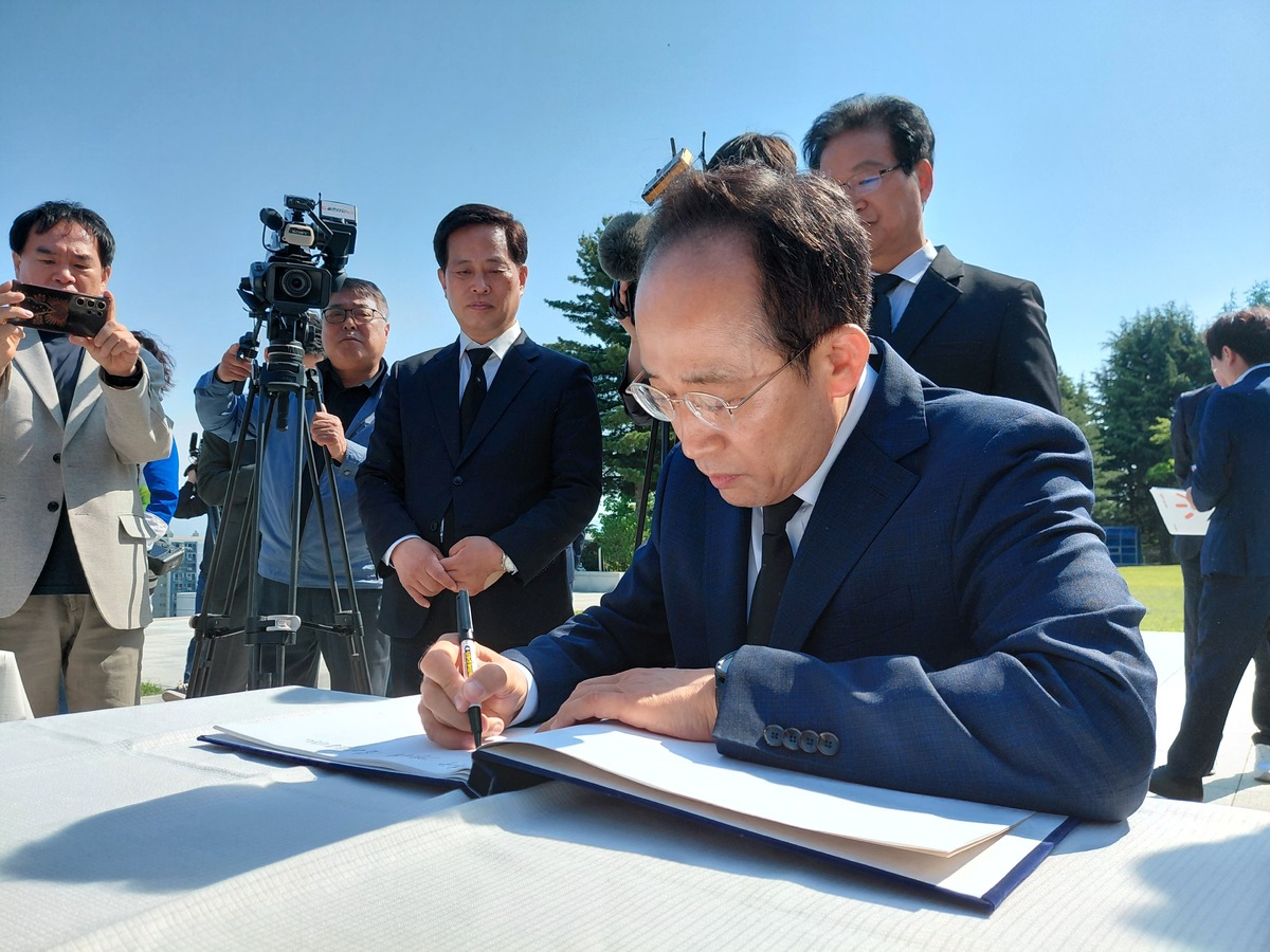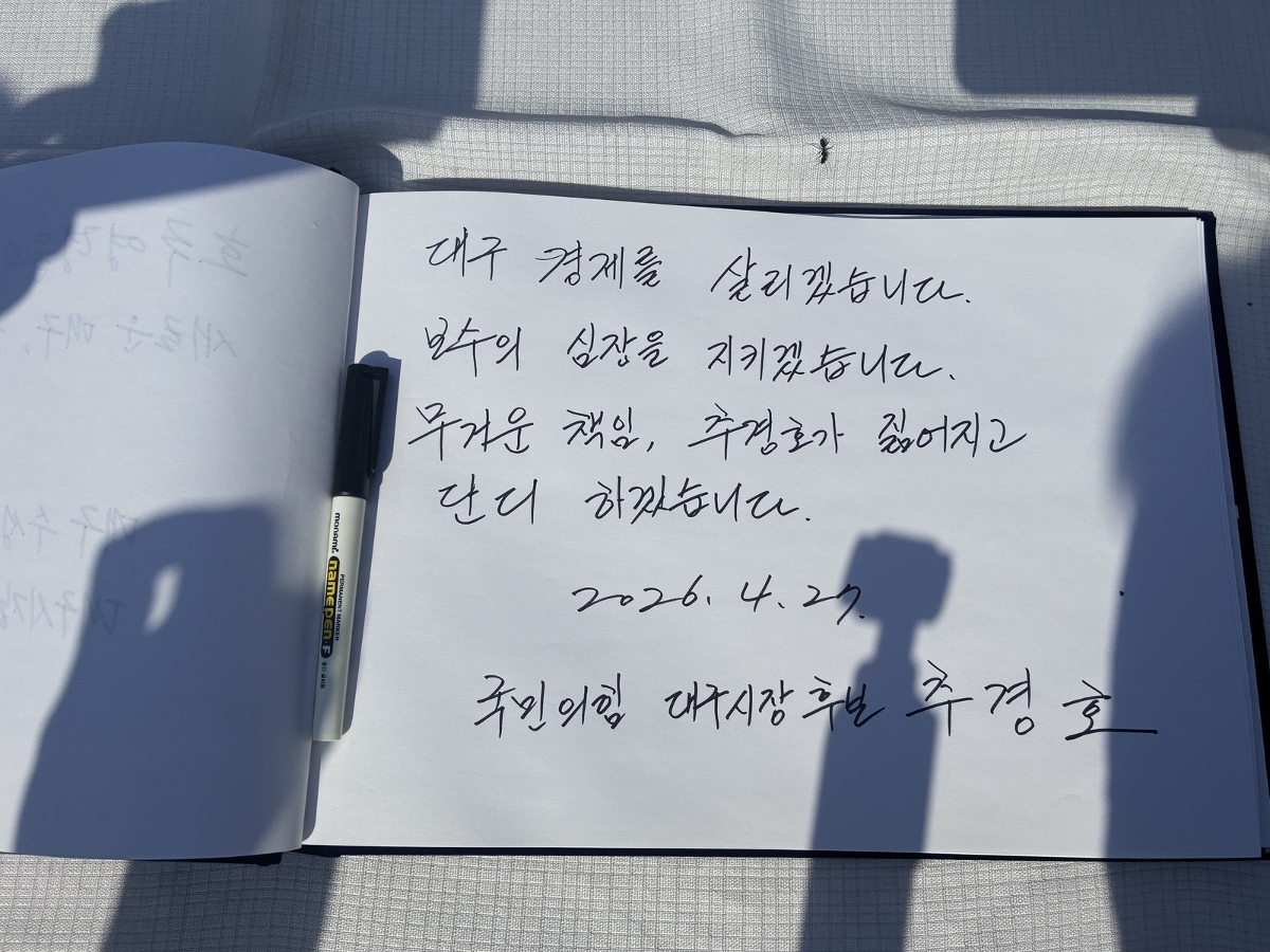 추 후보는 27일 오전 대구 남구 앞산 충혼탑을 찾아 헌화와 분향, 묵념을 하며 순국선열과 호국영령을 기렸다. 참배록에는 “대구 경제를 살리겠습니다. 보수의 심장을 지키겠습니다. 무거운 책임 추경호가 짊어지고 단디하겠습니다”라고 적었다.