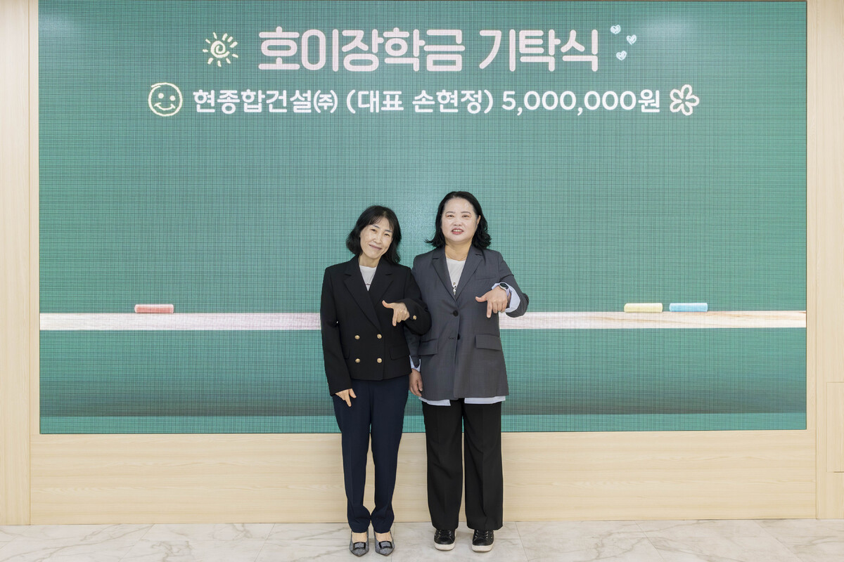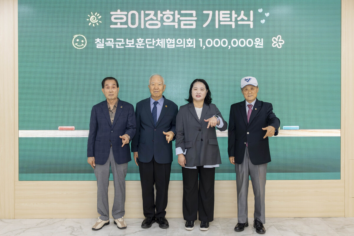 칠곡군보훈단체협의회는 최근 지역 인재 육성과 교육 발전에 써달라며 호이장학금 100만 원을 (재)칠곡군호이장학회에 기탁했다. 또 현종합건설㈜(대표 손현정)는 500만 원을 전달하며 지역 학생들이 더 나은 환경에서 꿈을 키워가길 바란다는 뜻을 전했다.