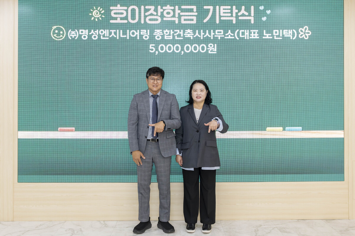 이어 ㈜명성엔지니어링 종합건축사사무소(대표 노민택)도 500만 원을 기탁하며 미래 인재 양성을 위한 지역사회의 관심과 지원이 지속되길 기대했다.