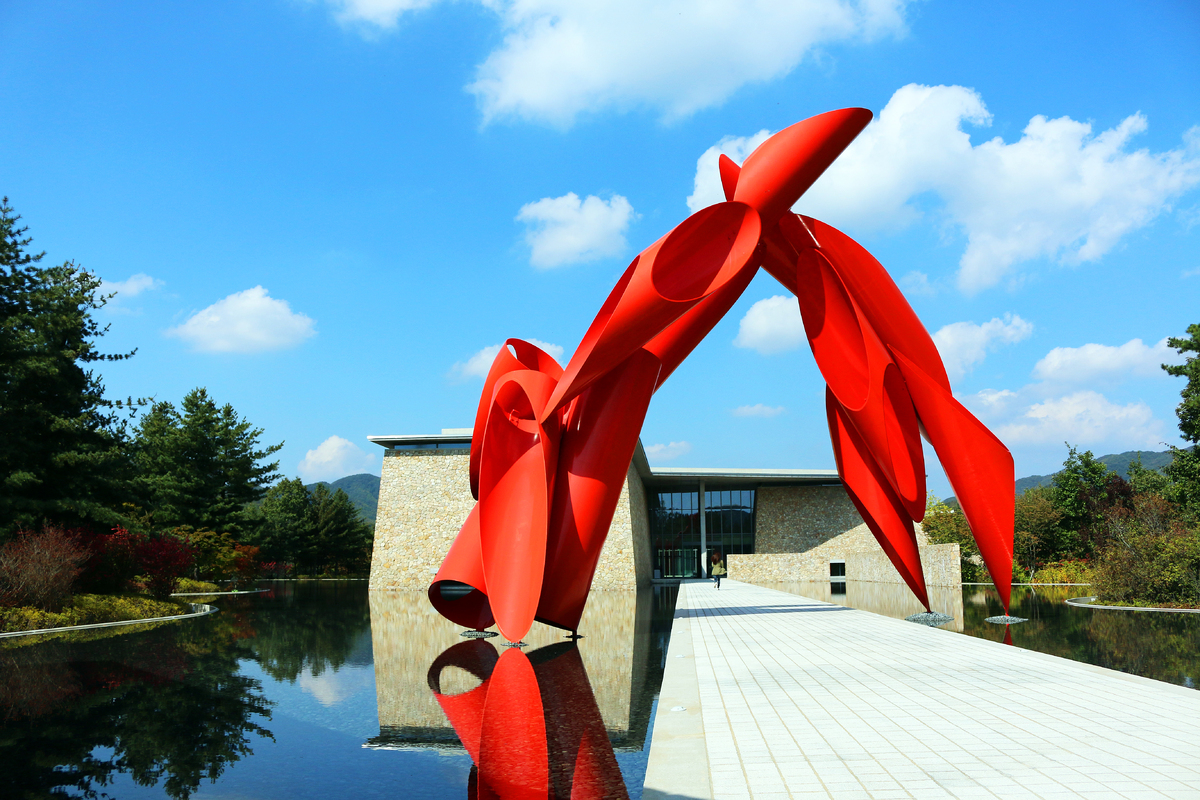 플라워가든과 워터가든 사이를 잇는 것은 자작나무 숲이다. 360여 그루의 자작나무가 도열하듯 서서 관람객을 맞는다. 자작나무 숲 너머로 앤서니 카로 등 세계적인 조각가들의 작품이 전시된 조각정원이 보인다. 워터가든은 안도 다다오 건축의 특징인 물의 이미지를 고스란히 보여주는 곳이다. 연못 가운데 난 길 위로 마치 박물관의 정문 같은 거대한 붉은 조각품이 보인다. 알렉산더 리버만의 1998년 작품 아치웨이(Archway)다. 비스듬히 절단한 붉은 원기둥이 연못에서 얼기설기 솟아나 아치를 이룬다.