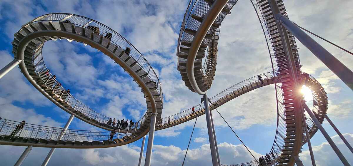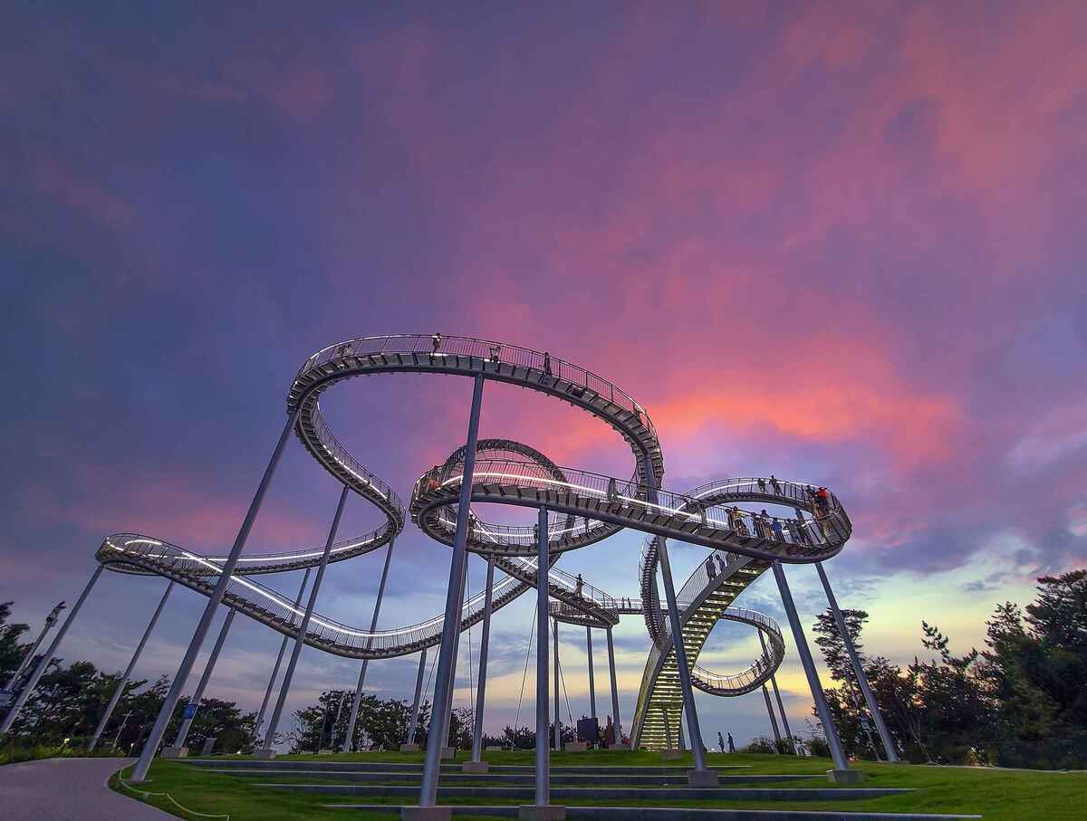 스페이스 워크는 지상에서 올려다보면 거대한 롤러코스터처럼 보인다. 철 구조물 트랙을 따라 천천히 걸음을 옮기니 울창한 숲과 포항시립미술관이 있는 환호공원, 오밀조밀 모여 있는 포항 도심이 한눈에 들어온다. 바다 쪽 계단을 걸을 때는 영일만 바다 위를 유영하는 기분이 든다.