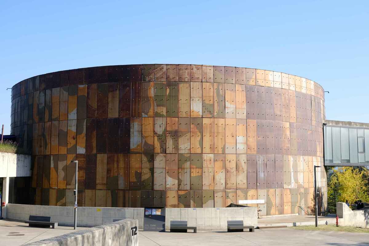 눈길을 끄는 건 T6, 커뮤니티센터다. 이 건물은 기존 탱크를 해체하며 나온 철판을 다시 활용해 지었다. 녹슨 철판이 외벽을 감싸고 있는 독특한 외관은 세월의 흔적을 그대로 드러낸다. 낡음이 오히려 디자인이 되는 순간이다. 원형 탱크 구조는 그대로 유지하면서 내부를 비워내고, 새로운 기능을 덧입혔다. 철제 구조물의 거친 질감과 현대적 설계가 공존하는 풍경은 과거와 현재가 충돌하는 듯한 묘한 긴장감을 만든다. 건축은 철거가 아닌 ‘재해석’을 통해 새로운 생명을 얻을 수 있다는 사실을 이곳은 말없이 증명한다.