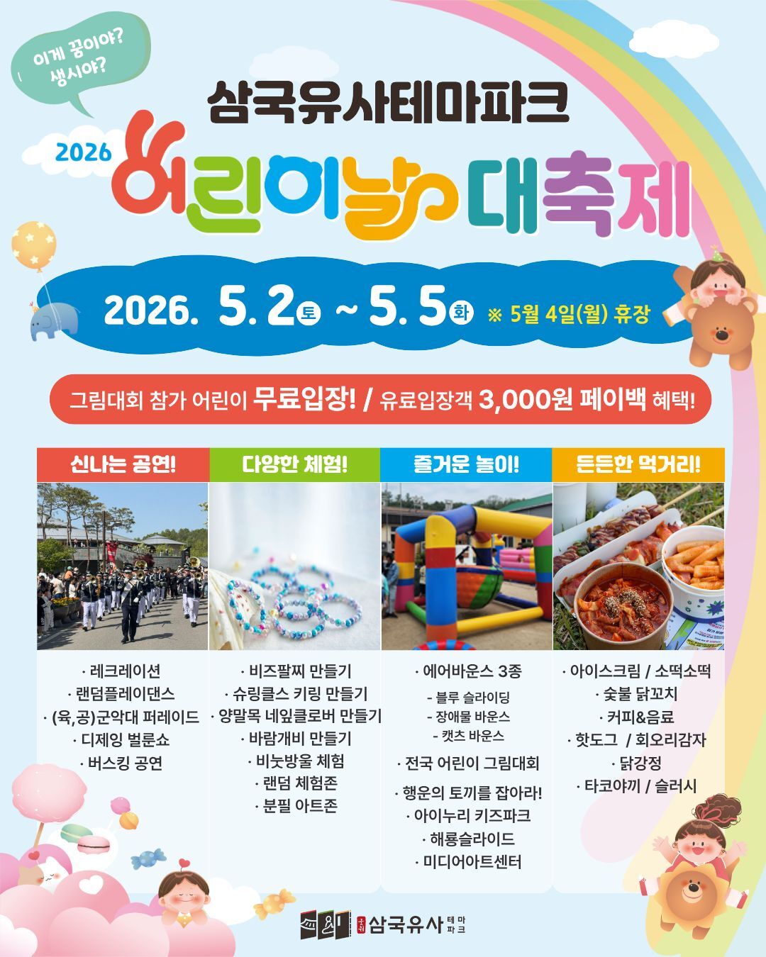 다가오는 어린이날 연휴, 삼국유사테마파크가 사흘간 집중 운영으로 완성도 높은 축제를 선보인다. 대구 군위문화관광재단은 ‘2026 어린이날 대축제’를 5월 2일과 3일, 어린이날 당일인 5일에 맞춰 진행한다고 밝혔다.