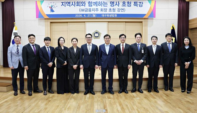 대구회생법원은 지난 27일 법원 신별관 대강당에서 iM금융지주 황병우 회장을 초청해 ‘지역사회와 함께하는 명사 초청 특강’을 개최했다. 행사에는 심현욱 법원장을 비롯해 법관 전원과 직원들이 참석했다.