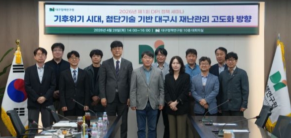 대구정책연구원은 지난 28일 연구원 10층 대회의실에서 ‘기후위기 시대, 첨단기술 기반 대구시 재난관리 고도화 방향’을 주제로 2026년 제1회 DPI 정책세미나를 개최했다. 세미나에는 이정임 대구시 안전정책관, 김성근 자연재난과장 등 관계 공무원과 학계·연구기관 전문가들이 참석했다.