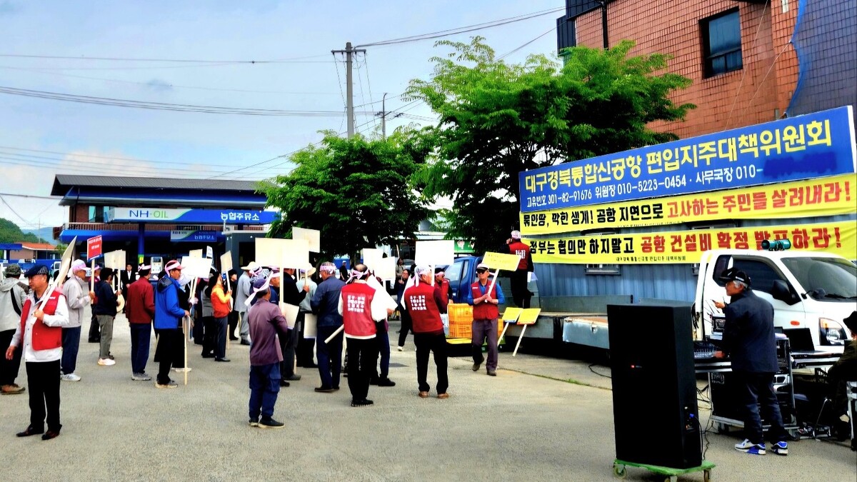 TK 민·군통합공항 편입지주 대책위원회(위원장 김기수)는 28일 오전 대구 군위군 소보면 군위농협 소보지점 앞에서 집회를 열고 사업 지연에 따른 피해 대책 마련을 촉구했다. 이날 집회에는 편입 주민 100여 명이 참석했다.