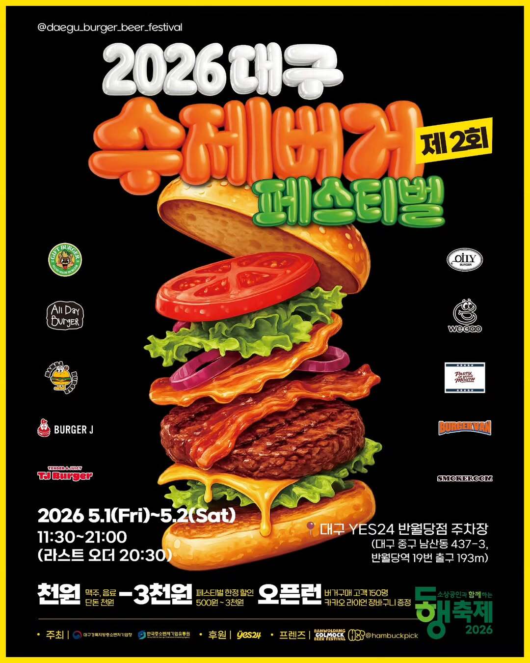 대경중기청은 5월 1일과 2일 이틀간 예스24 반월당점 일원에서 ‘2026 제2회 대구 수제버거 페스티벌’을 연다. 이번 행사는 중소벤처기업부가 추진 중인 동행축제의 지역 프로그램으로, 로컬 소상공인 제품 소비 촉진을 목표로 기획됐다.